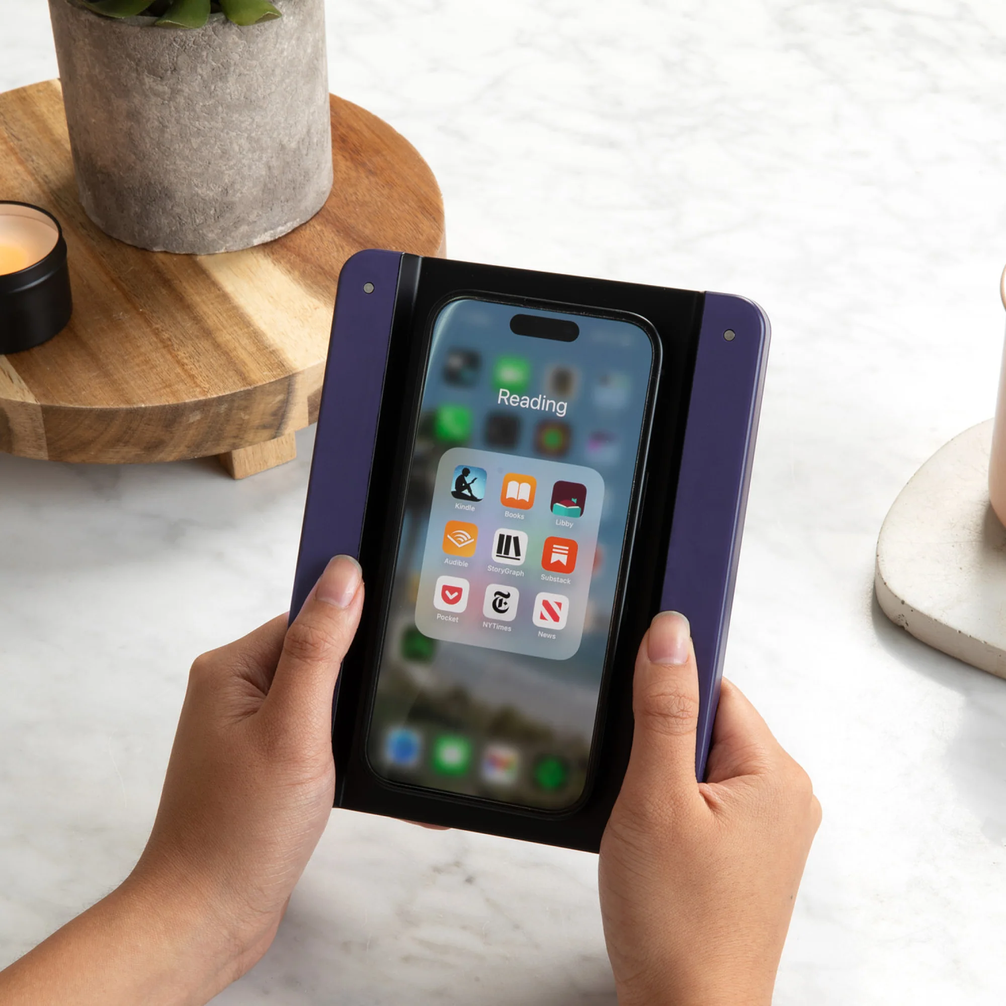 - Can I use Bookcase with my current phone case? Generally, yes. Bookcase adheres magnetically to your phone via its MagSafe ring and can do so with your existing case attached. When you're ready to read, simply place your phone (and attached case) into Bookcase.